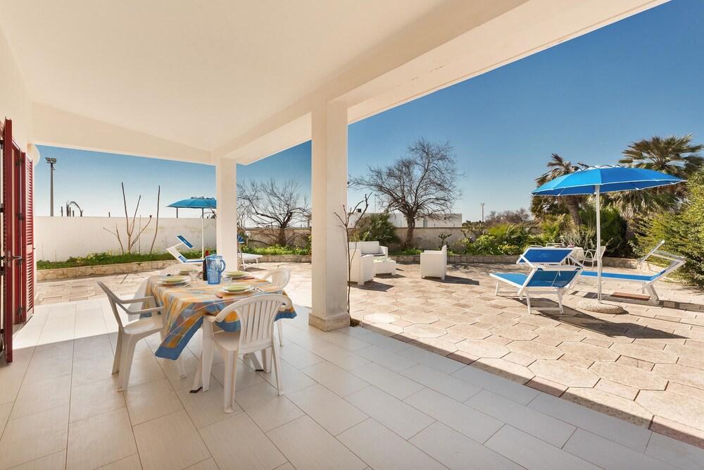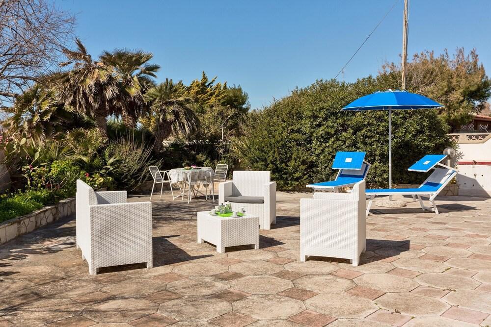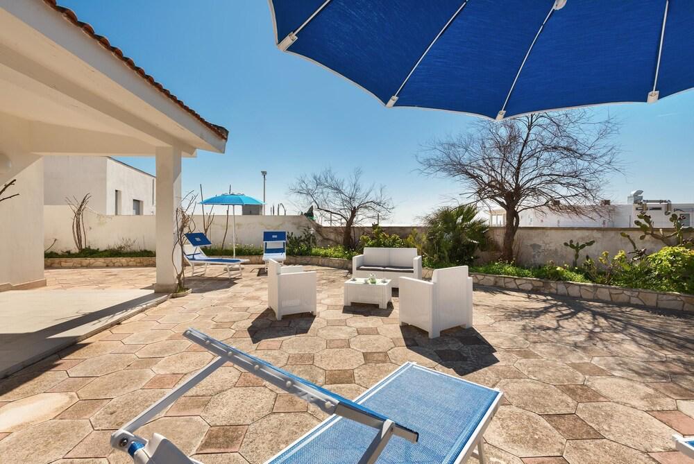 Villetta vacanza con aria condizionata di fronte alle magnifiche spiagge di Porto Cesareo e a pochi minuti dalle spiagge di Gallipoli e dalla favolosa Lecce. La villetta è composta da un bellissimo soggiorno living con divano letto matrimoniale, cucina attrezzata, due camere da letto, disimpegno, e due bagni di cui uno con doccia, lavanderia per un totale di 7/8 posti letto tutto finemente arredato, bellissimo e ampio spazio esterno con patio e giardino indipendente dove poter mangiare fuori in pieno relax a pranzo e a cena utilizzando il barbecue, con doccia esterna e posti auto. Soluzione ideale per chi vuole godere della vicinanza delle più belle spiagge salentine e di tutti i servizi arrivabili a piedi
